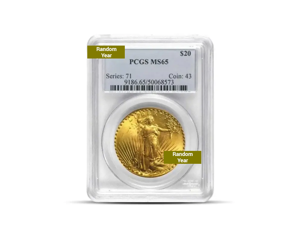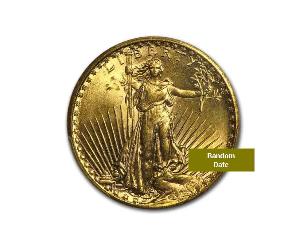This random year dated $20 Saint Gaudens .900 fine gold coin, graded MS65 by NGC or PCGS, is a magnificent and historically significant piece. Designed by Augustus Saint-Gaudens, it features his iconic Liberty striding forward on the obverse and a powerful eagle in flight on the reverse