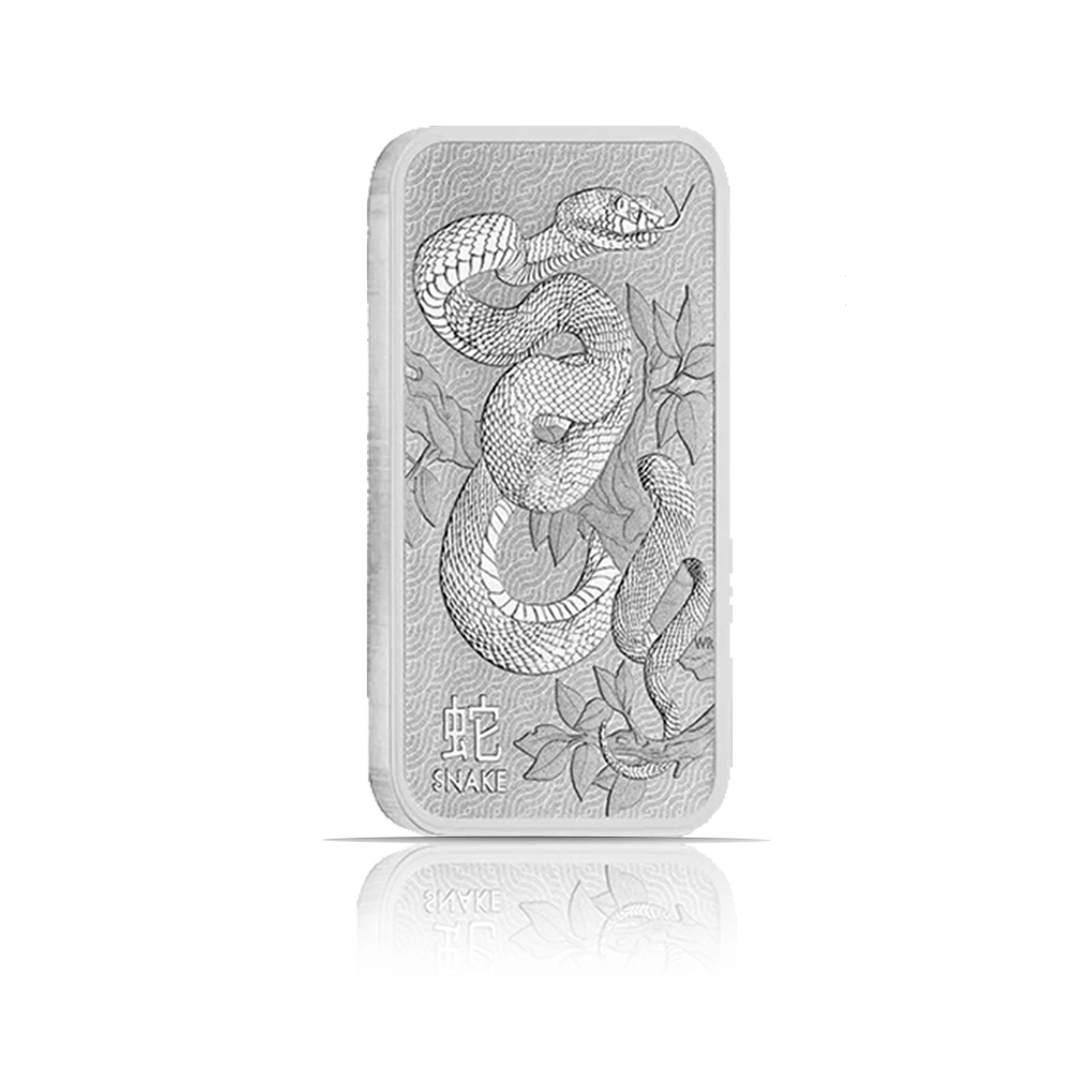 This 2025 minted bar from the Perth Mint in Australia contains 1 oz of .9999 fine silver. It celebrates the Year of the Snake with a stylized design and arrives in a tamper-evident assay card with a unique serial number.
