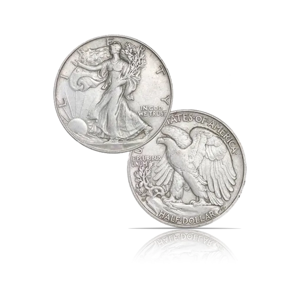 This half-dollar coin contains approximately 0.3617 oz of silver. The obverse features Adolph A. Weinman’s “Walking Liberty,” and the reverse depicts an eagle perched on a mountain crag. Provided in circulated condition with .900 fine silver purity.