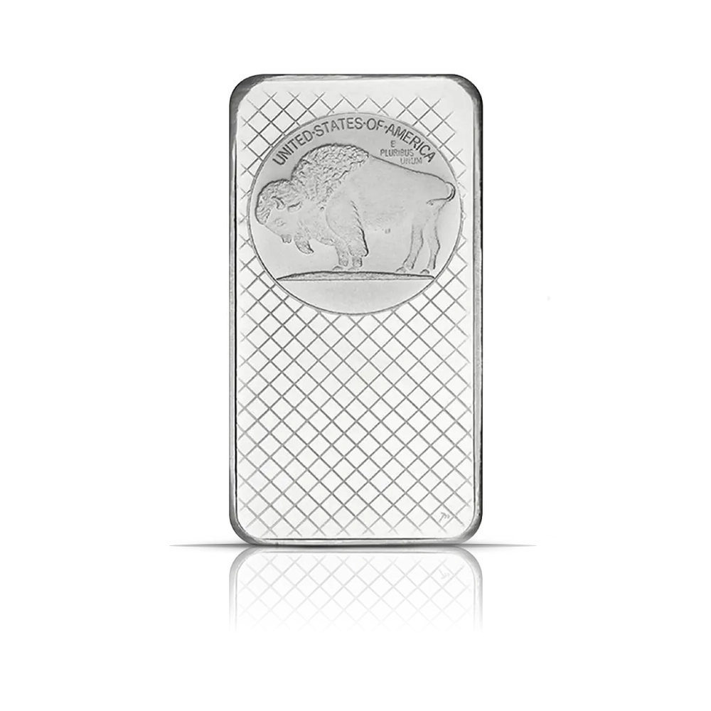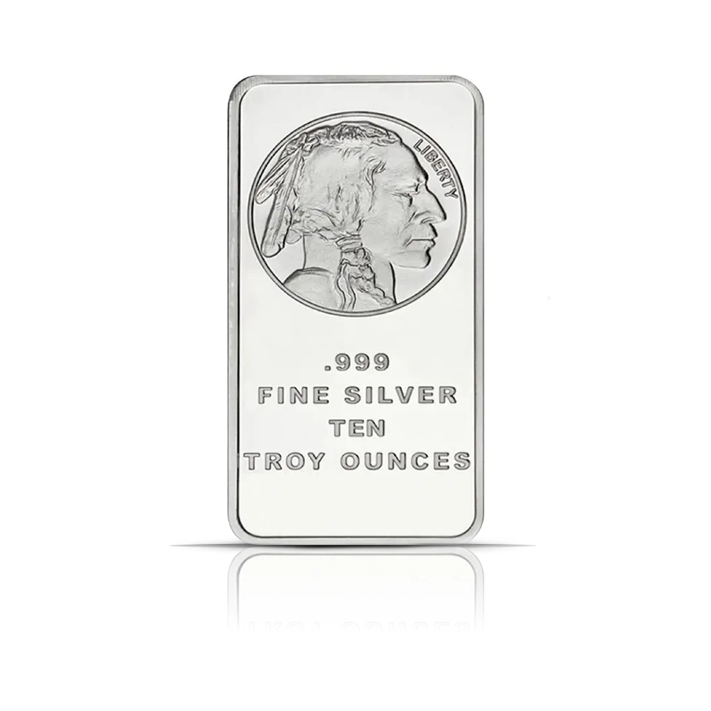 This 10 oz .999 fine silver bar by SilverTowne, minted in the United States, features the iconic Buffalo design, with a Native American profile on the obverse and an American bison on the reverse.