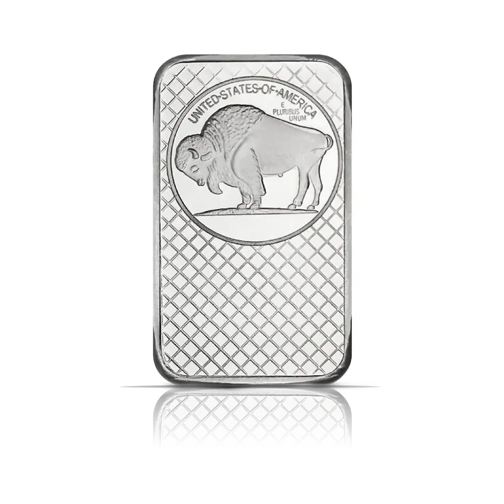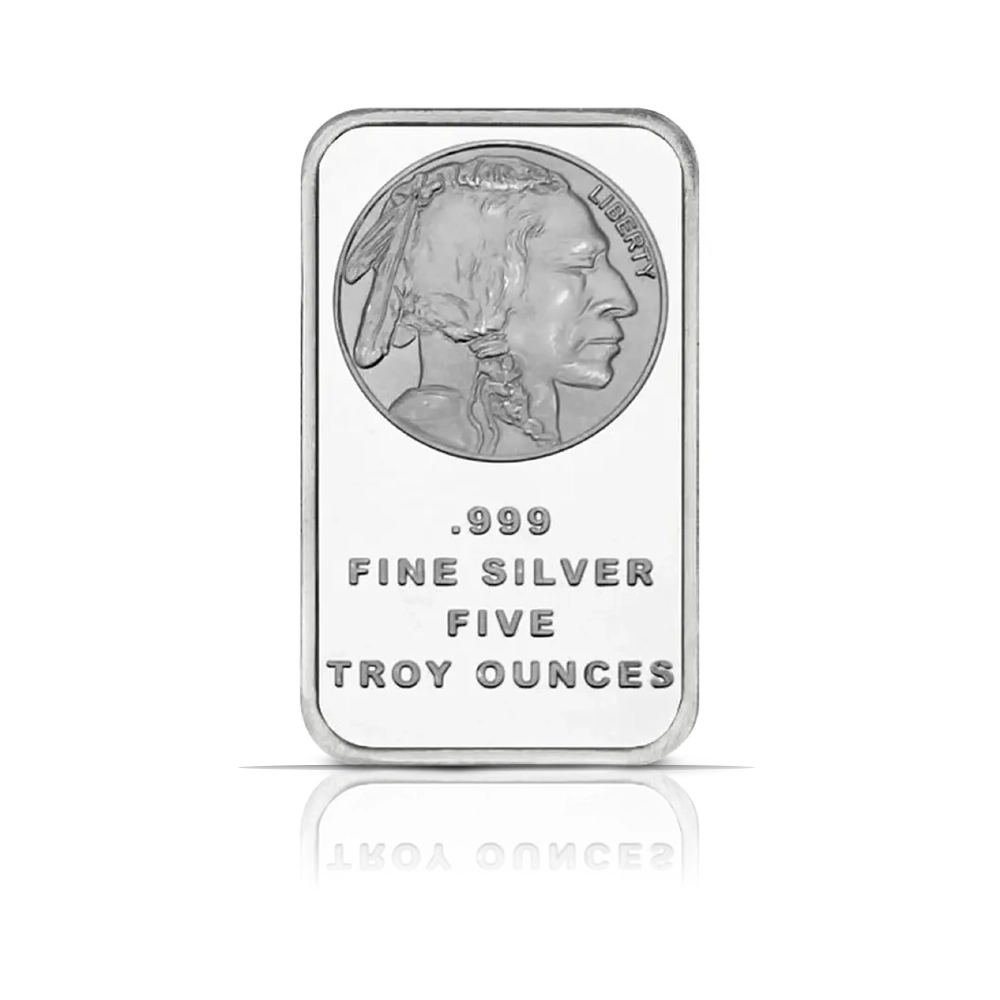 This 5 oz .999 fine silver bar by SilverTowne, minted in the United States, features the iconic Buffalo design, with a Native American profile on the obverse and an American bison on the reverse.
