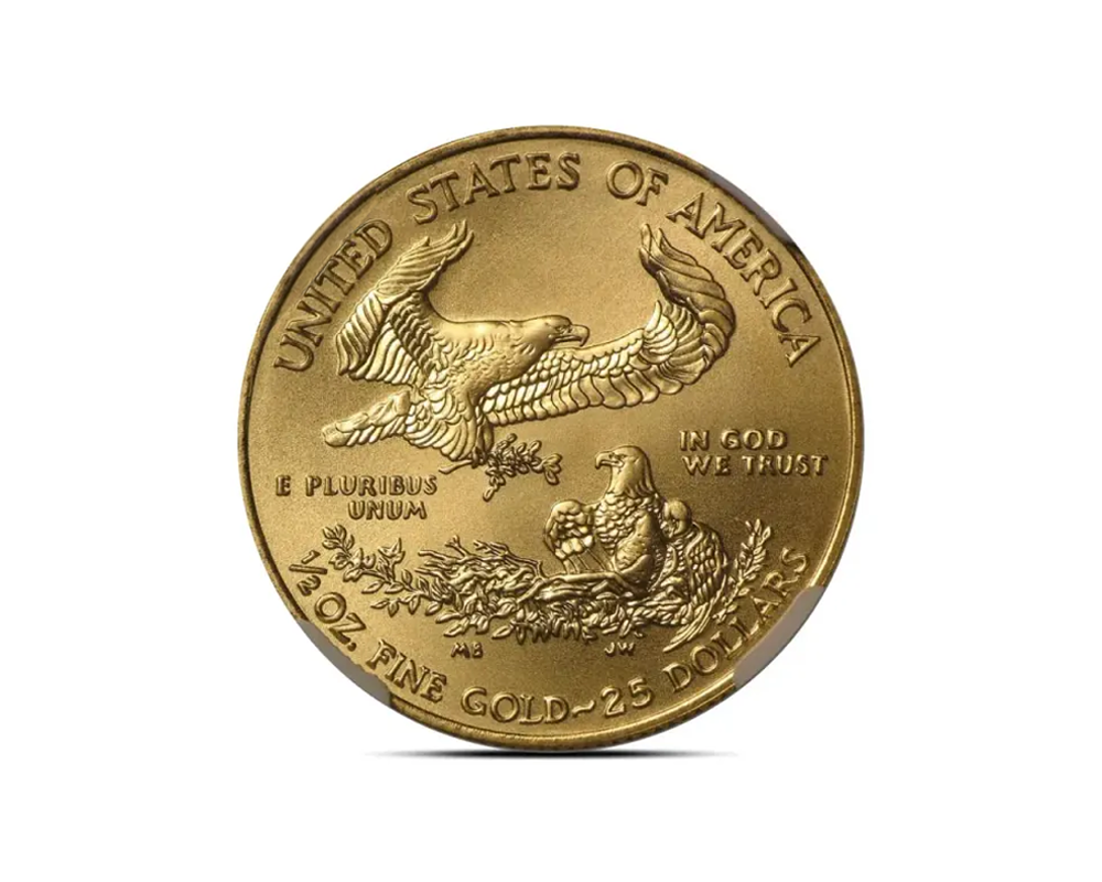 This random year American Eagle 1/2 oz gold coin is .9167 fine gold. It features Augustus Saint-Gaudens’ Liberty design and an eagle design. It is produced by the United States Mint.