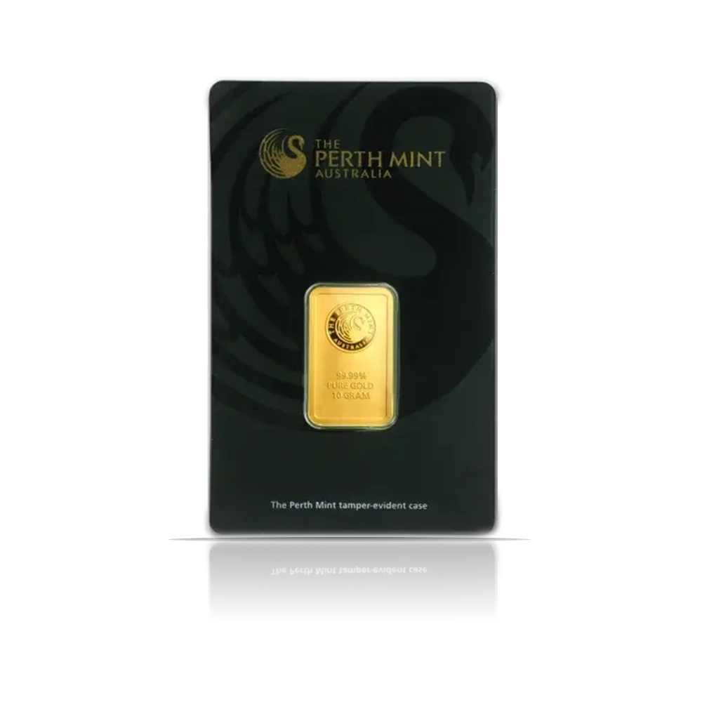 This 10 gram minted bar from the Perth Mint in Australia contains .9999 fine gold. It carries the internationally recognized swan assay mark and comes in tamper-evident packaging, making it a highly liquid and trusted investment piece.