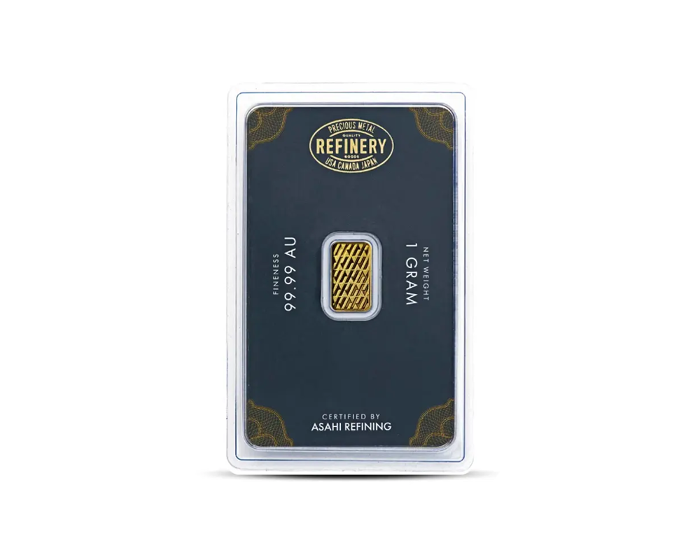 A standard 1 gram .9999 pure gold bar from Asahi Refining, a popular way to invest in gold.
