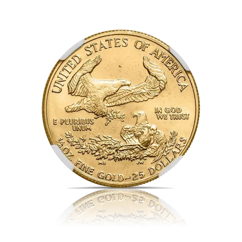 This 1986 America Eagle 1/2 oz .9167 fine gold coin, graded MS69 by NGC, is a significant piece from the inaugural year of this iconic series. It features Augustus Saint-Gaudens’ majestic Liberty striding forward on the obverse and a powerful family of eagles on the reverse.