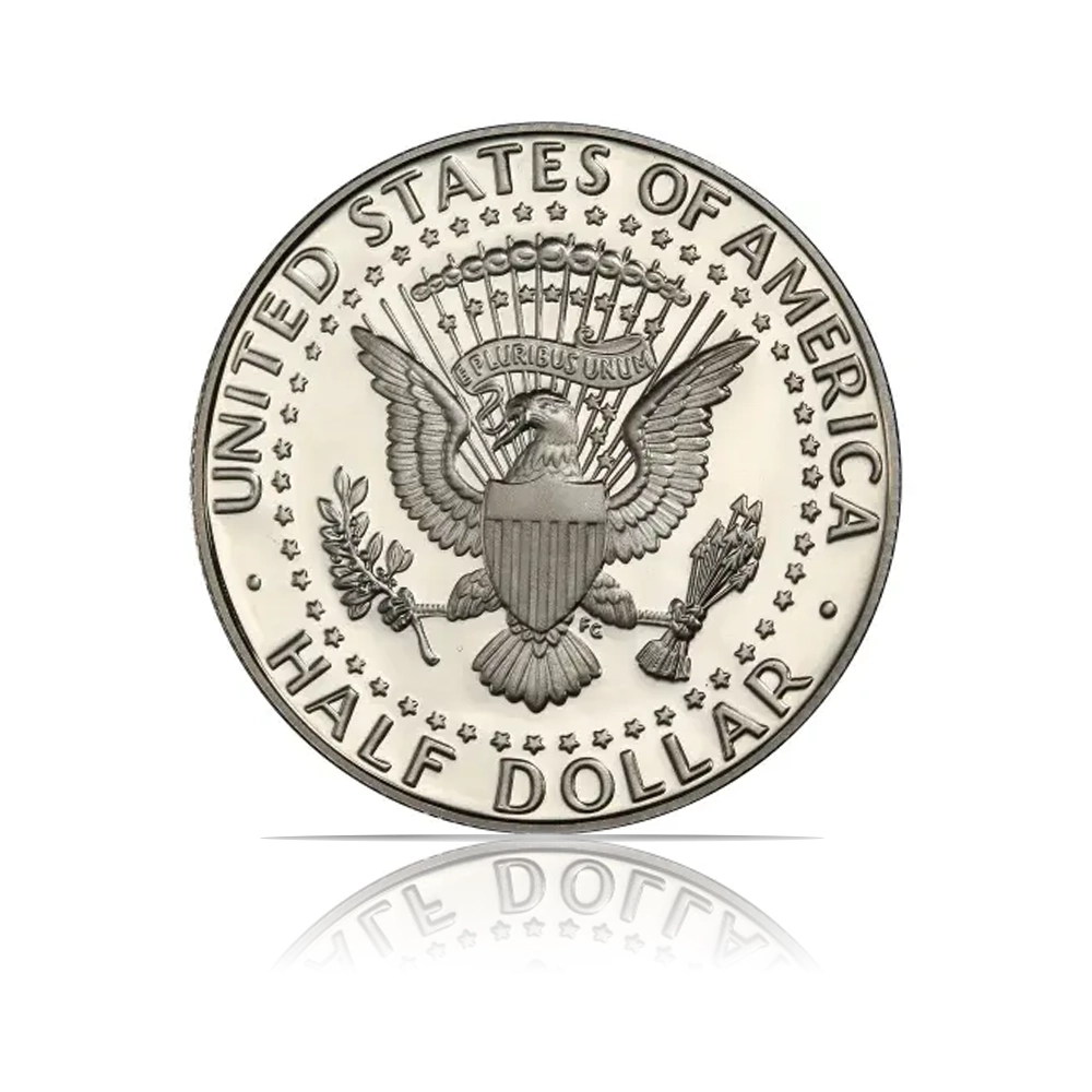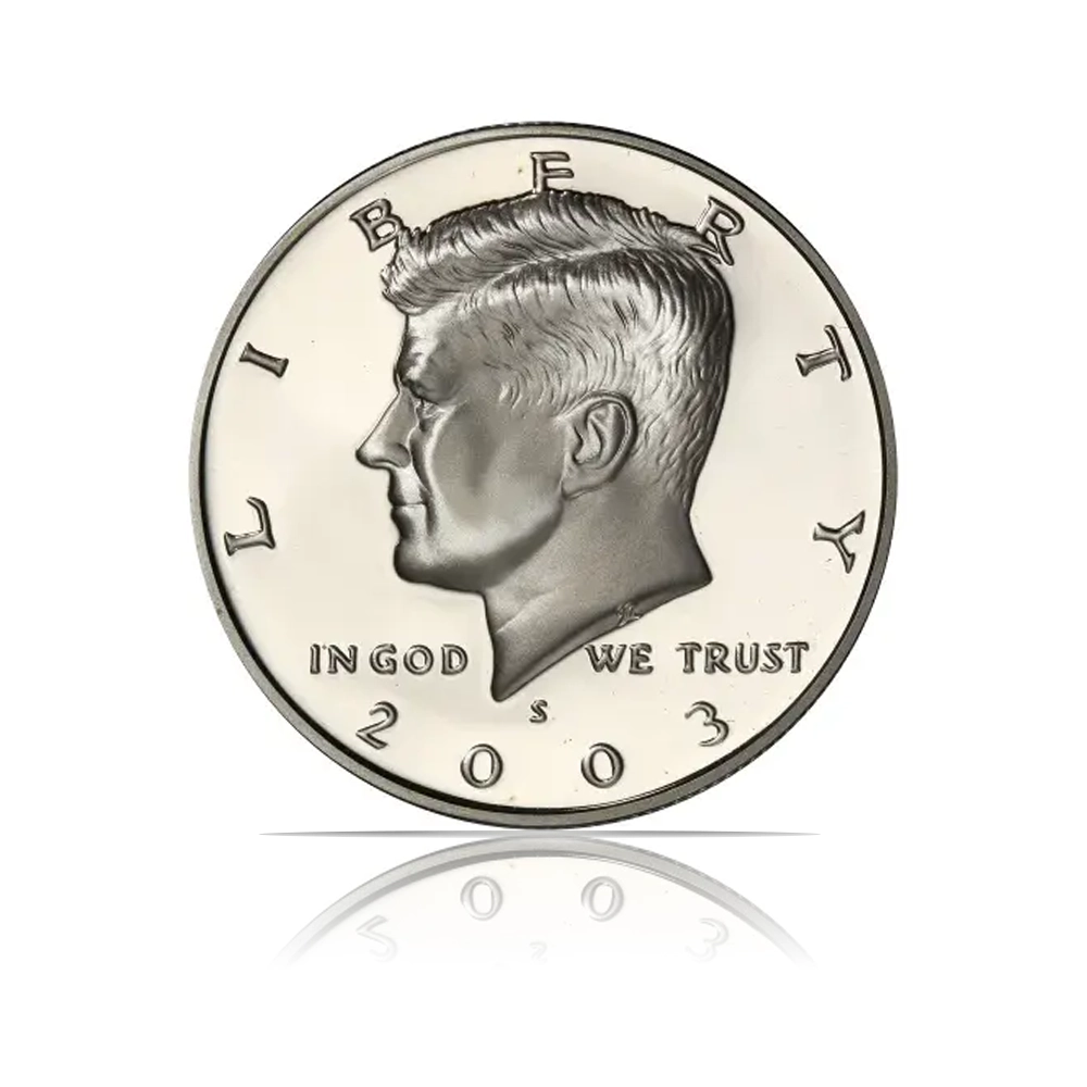 A 2003 Kennedy Half Dollar with a special proof finish and minted at the San Francisco Mint (“S”). This commemorative coin is composed of 90% silver and 10% copper, with an actual silver weight of 0.3617 troy oz. It has a face value of 50 cents.