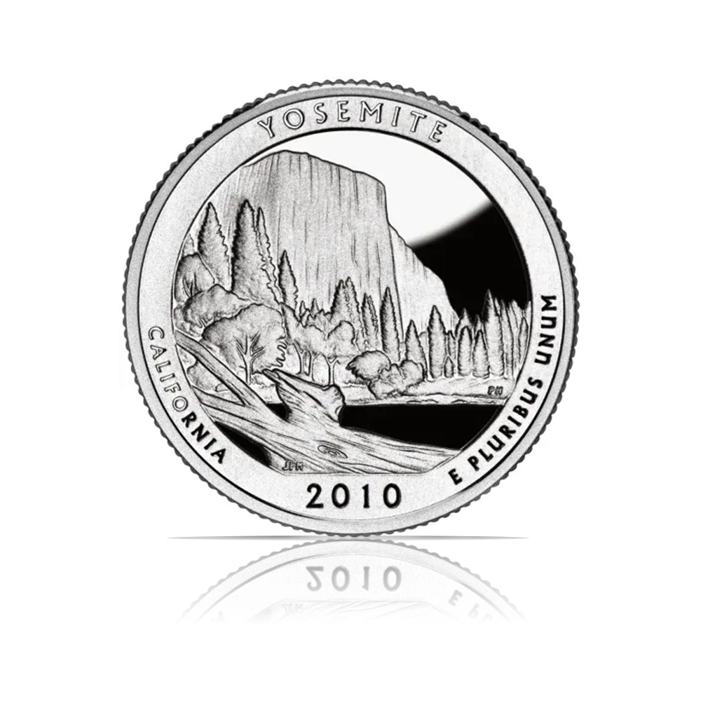 This 2010 S America the Beautiful Quarter is a .900 fine silver proof coin of Yosemite by the United States Mint. It features a design depicting El Capitan.