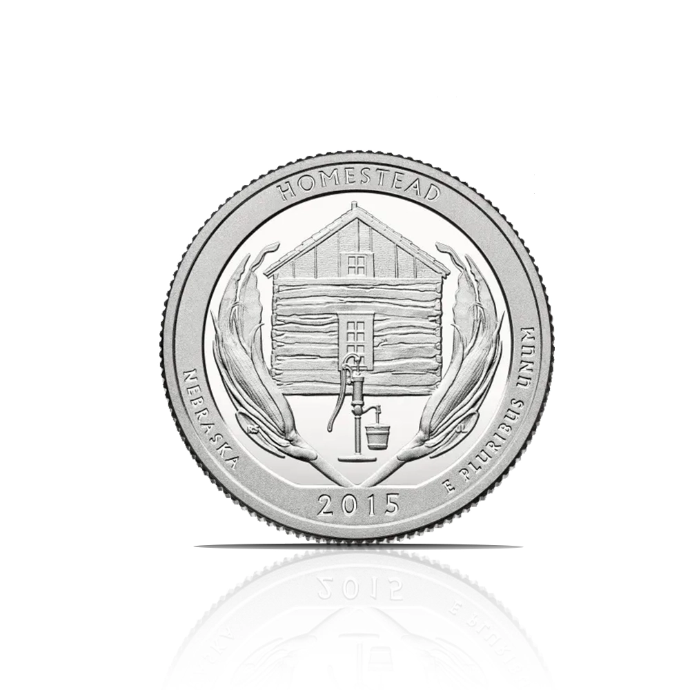 This 2015 S America the Beautiful Quarter is a .900 fine silver proof coin of Homestead by the United States Mint. It features a design representing food, shelter, and water, fundamental to Homesteaders.