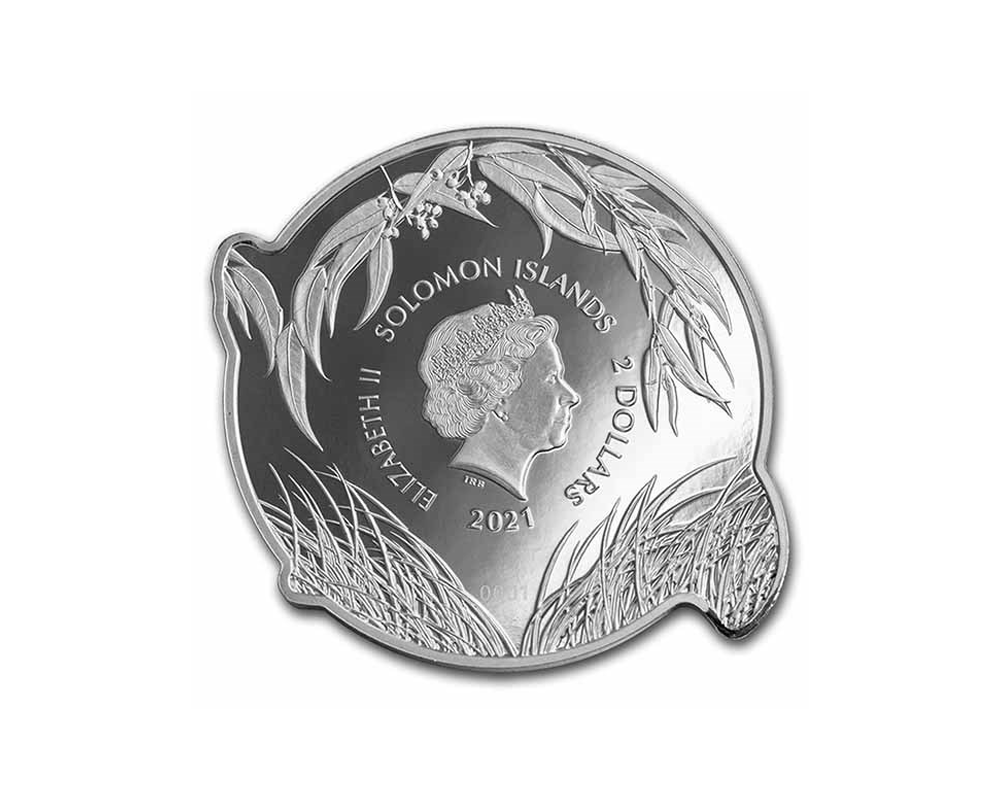 This 2021 PAMP 1 oz of .9999 fine silver round, issued for the Solomon Islands, features a Prooflike Tasmanian Tiger design. On the other side, “ELIZABETH II . 2 DOLLARS . SOLOMON ISLANDS . 2 DOLLARS . 2021” text in a circle with Queen Elizabeth II in the center.