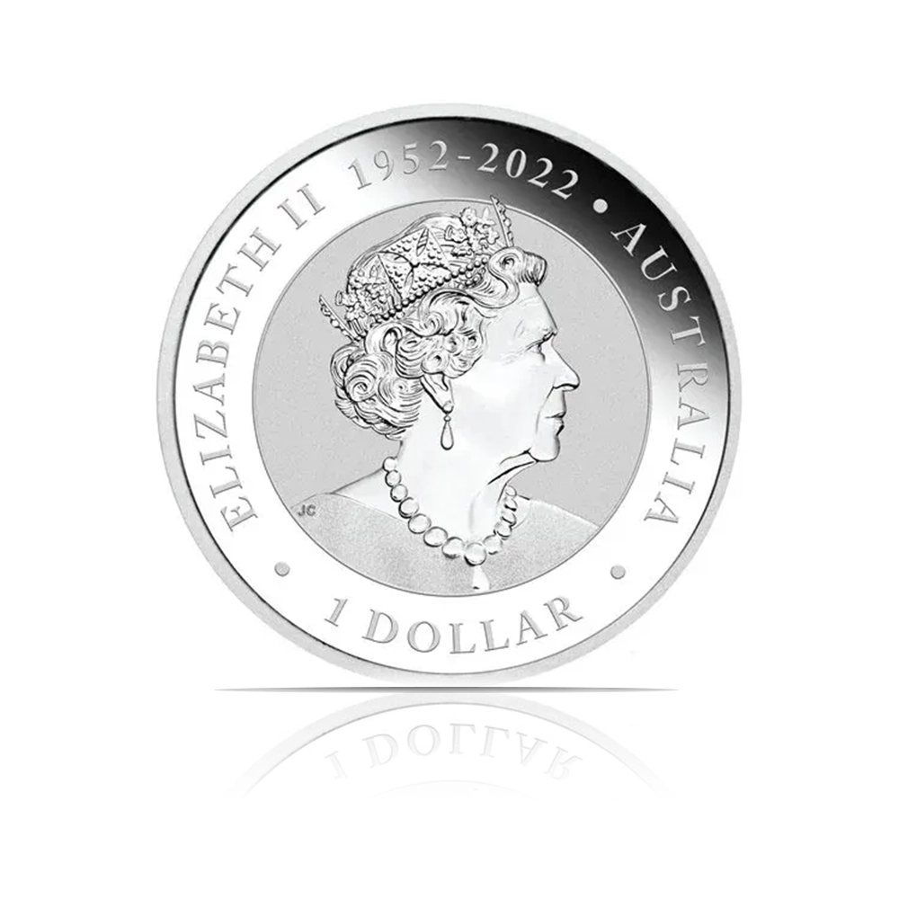 A 2023 coin from the Perth Mint, this 1 oz coin of .9999 fine silver features a new design of a wedge-tailed eagle perched on a branch. It is issued in Brilliant Uncirculated (BU) condition with a face value of $1 (AUD) and has a limited mintage.