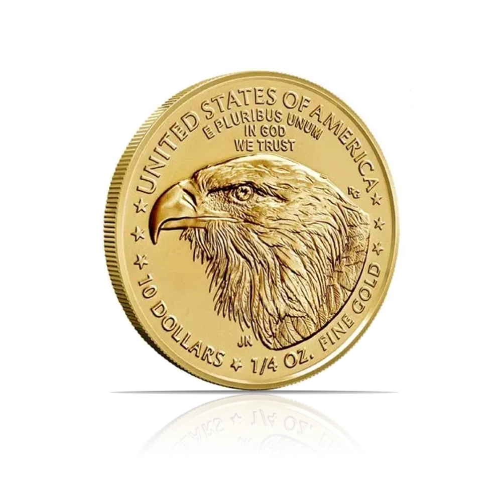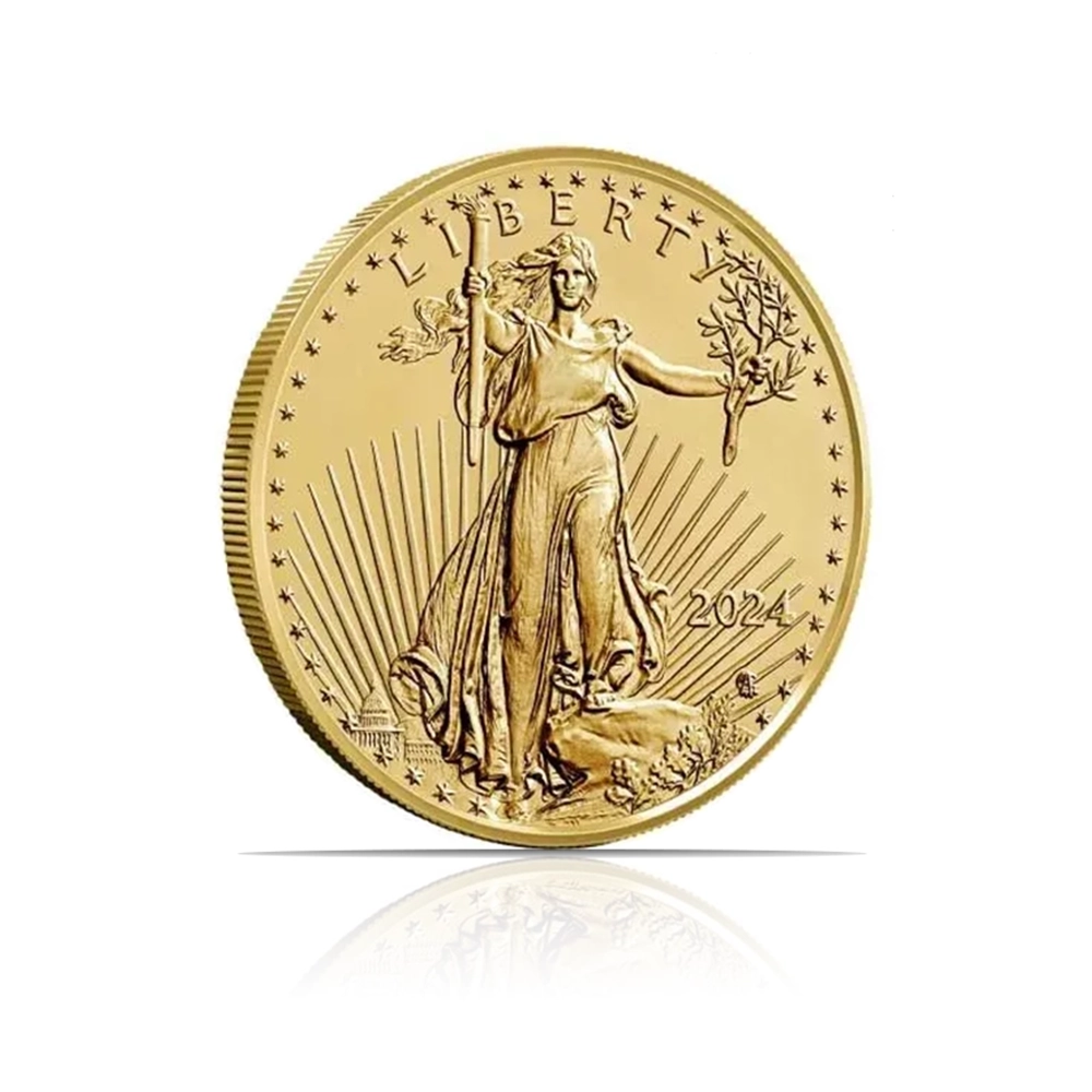The 2024 American Eagle (BU) 1/4 oz of fine gold coin is a pristine, Brilliant Uncirculated piece from this iconic series. Features Adolph A. Weinman’s “Walking Liberty” design on the obverse and John Mercanti’s heraldic eagle on the reverse.