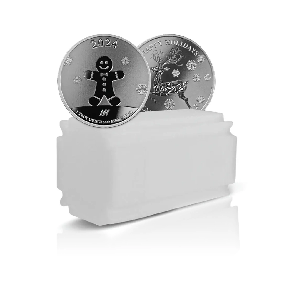 A festive choice from Asahi Refining. This tube contains 20 Christmas-themed 1 oz .999 pure silver rounds, perfect for holiday stacking.