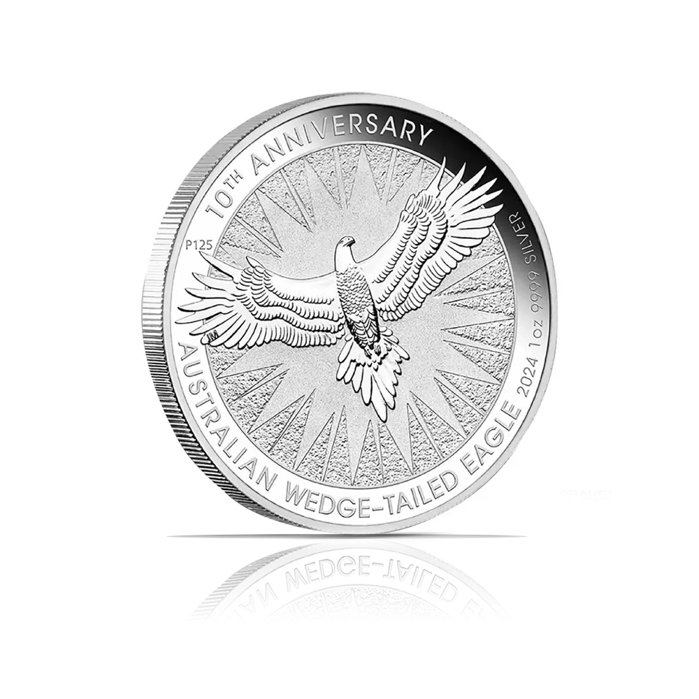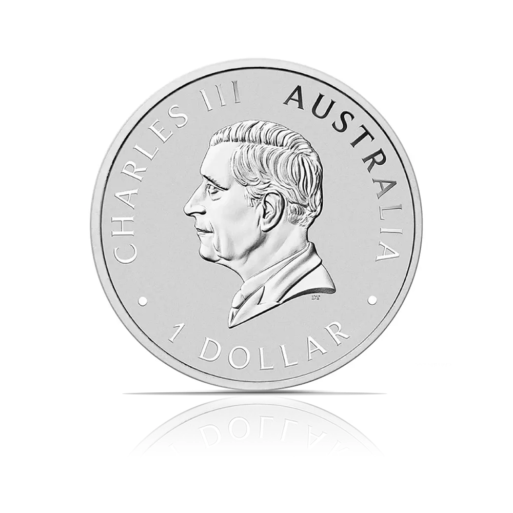 A 2024 coin from the Perth Mint, this 1 oz coin of .9999 fine silver celebrates the series’ 10th anniversary with a new design of a soaring wedge-tailed eagle. The obverse features King Charles III, and the coin has a face value of $1 (AUD). It is issued in Brilliant Uncirculated (BU) condition.