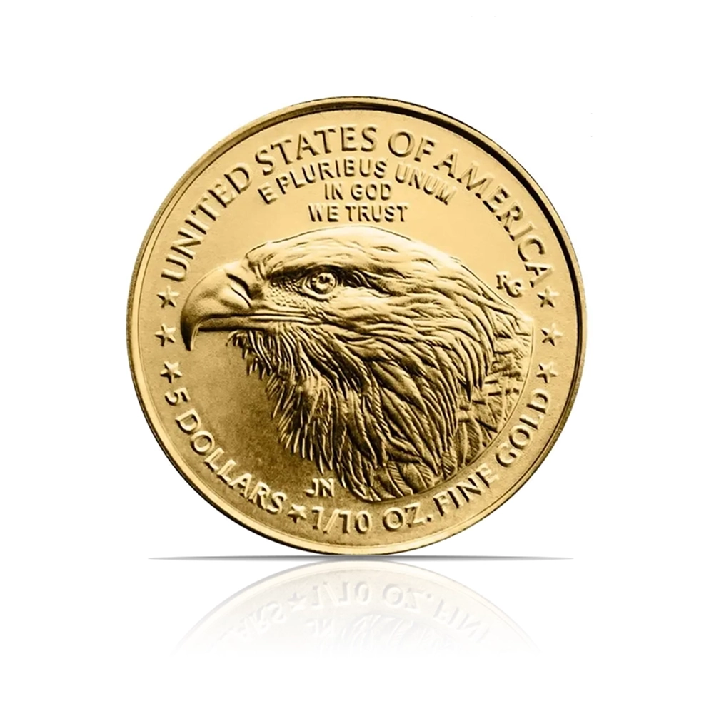 The 2025 American Eagle (BU) 1/10 oz of fine gold coin is a pristine, Brilliant Uncirculated piece from this iconic series. Features Adolph A. Weinman’s “Walking Liberty” design on the obverse and John Mercanti’s heraldic eagle on the reverse.