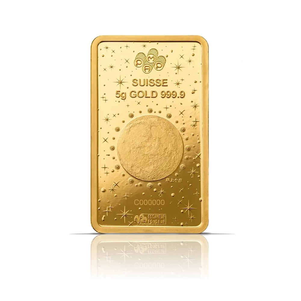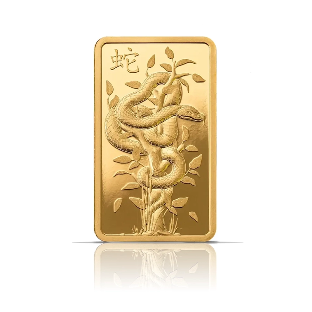 This 2025 PAMP from the Lunar Snake series design is a 5 Gram of .9999 fine gold bar, originating from Switzerland. The obverse features the intricate Lunar Snake motif for the year 2025, while the reverse displays the PAMP logo, purity, weight with unique serial number.