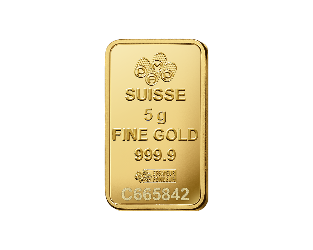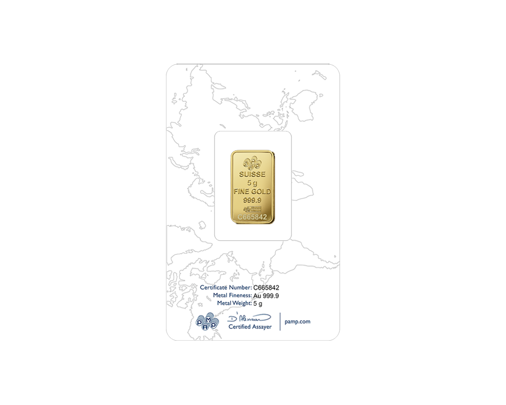 This PAMP 5 Gram of .9999 fine gold bar, originating from Switzerland, features an elegant Rosa (rose) design. In the reverse, the PAMP logo, purity, weight with unique serial number.