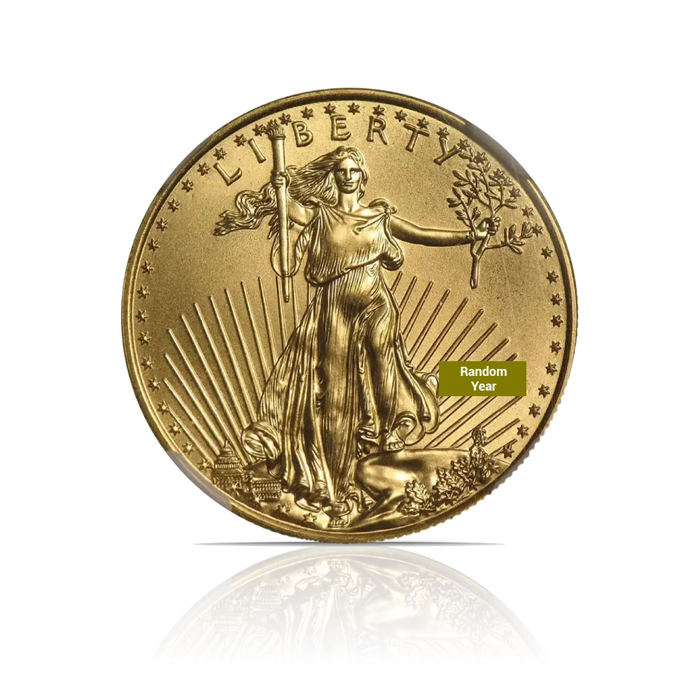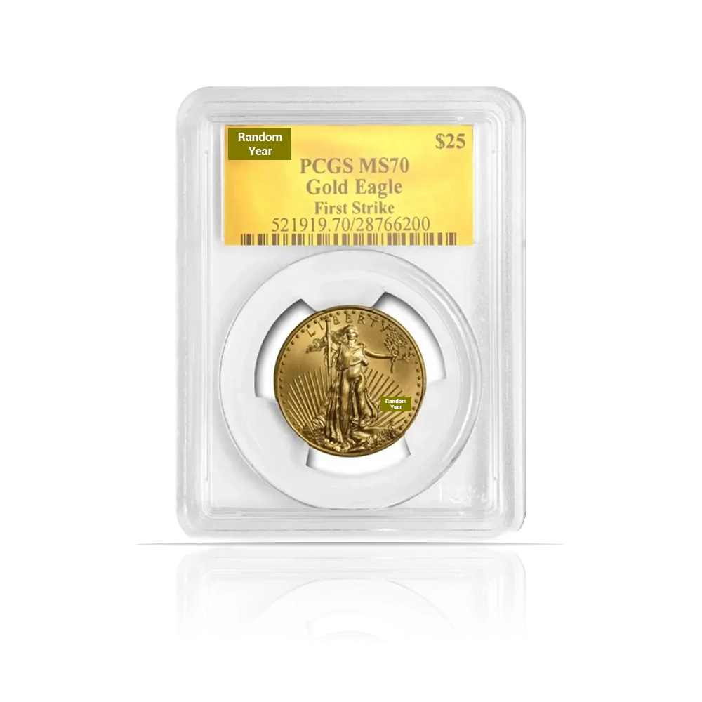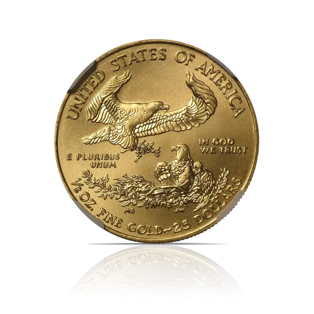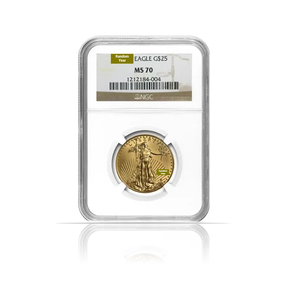A flawless 1/2 oz American Gold Eagle of random year, struck in 22-karat gold (0.9167 fine). This coin has been certified with the highest possible grade, MS70, by either PCGS or NGC, guaranteeing it is a perfect specimen with no visible flaws.