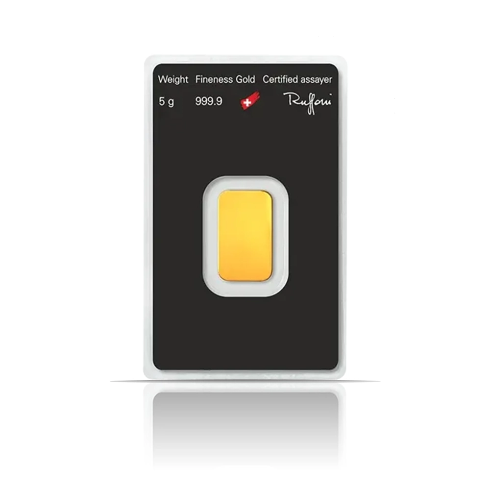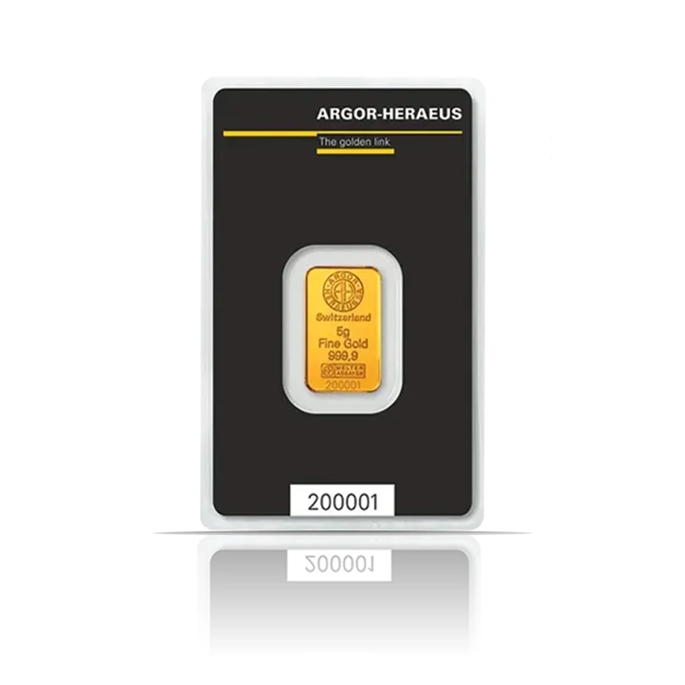 A compact 1 gram .9999 pure gold bar from Argor-Heraeus, with its hallmarks on the obverse and a blank reverse.