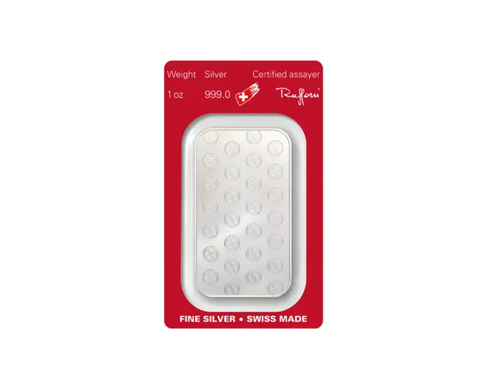 A standard 1 oz .999 pure silver bar from Argor-Heraeus, with official markings on the obverse and a blank reverse.