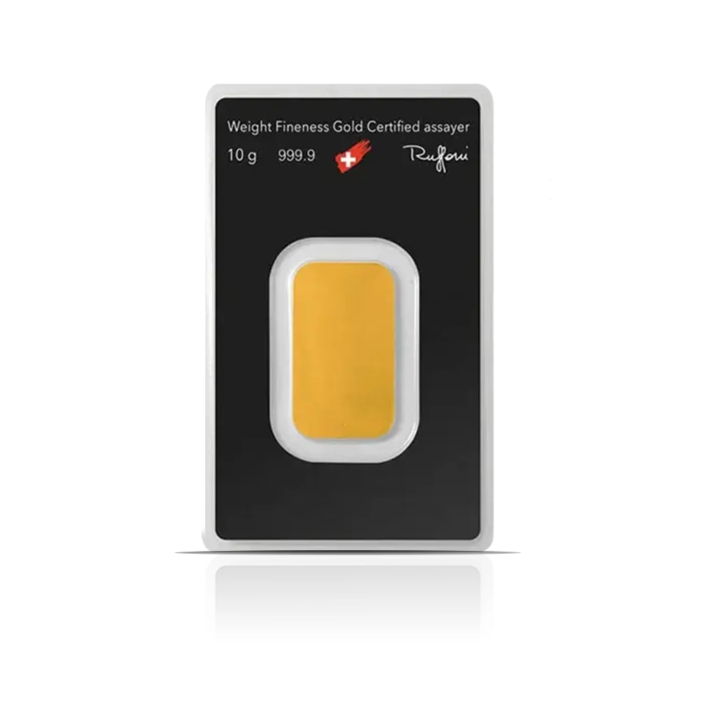 A classic 10 gram .9999 pure gold bar from Argor-Heraeus, with the mint, purity, and weight on the obverse. The reverse is blank.