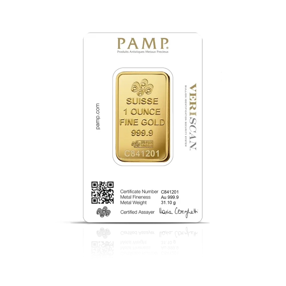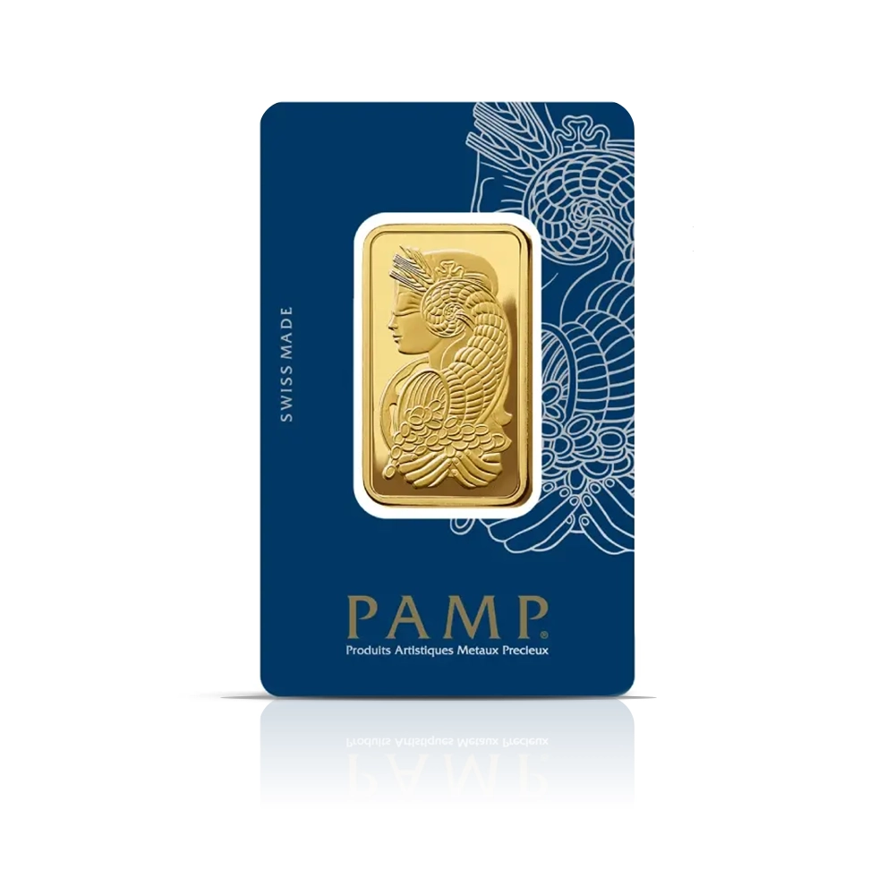 This PAMP from the renowned Lady Fortuna series design is a 1 oz of .9999 fine gold bar, originating from Switzerland. The obverse depicts Lady Fortuna, the Roman goddess of prosperity, while the reverse displays the PAMP logo, purity, weight with unique serial number.