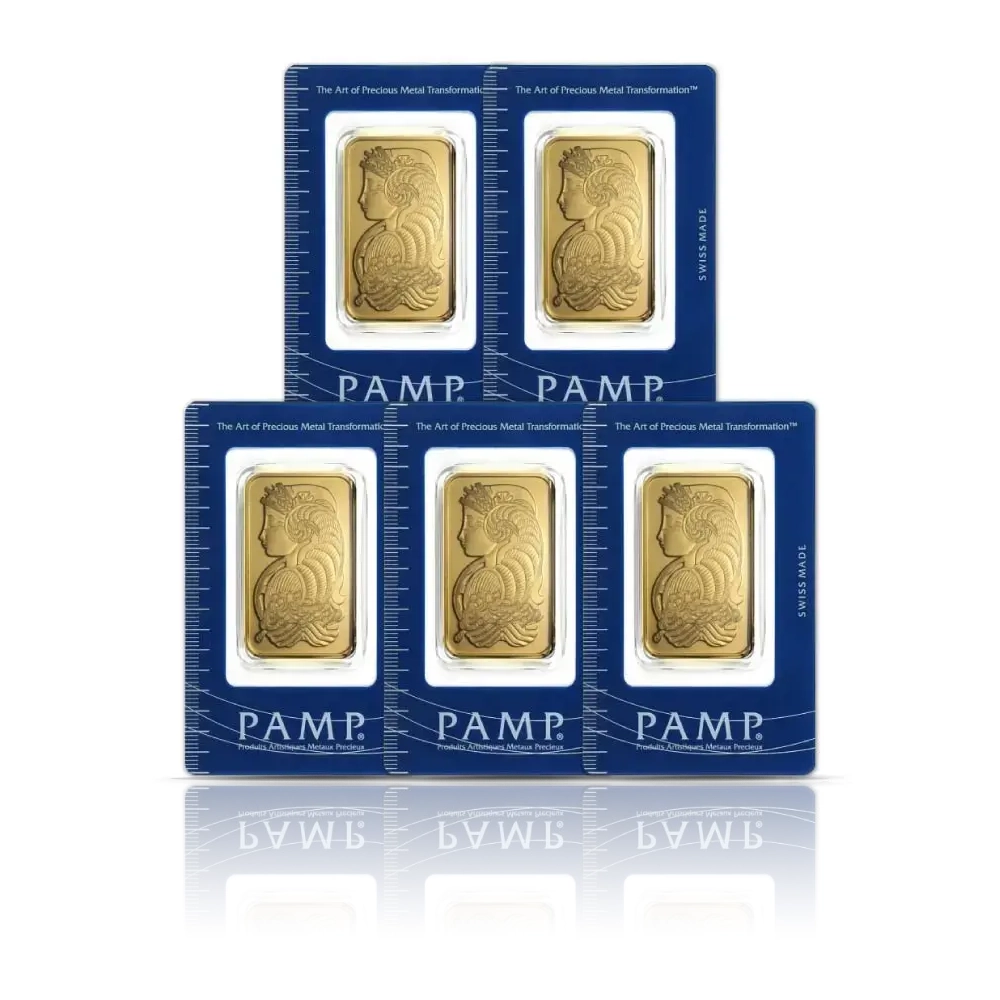 This set contains five PAMP Suisse bars from the renowned Lady Fortuna series design, each a 1 oz of .9999 fine gold bar, originating from Switzerland. The obverse depicts Lady Fortuna, the Roman goddess of prosperity, while the reverse displays the PAMP logo, purity, weight, and a unique serial number.