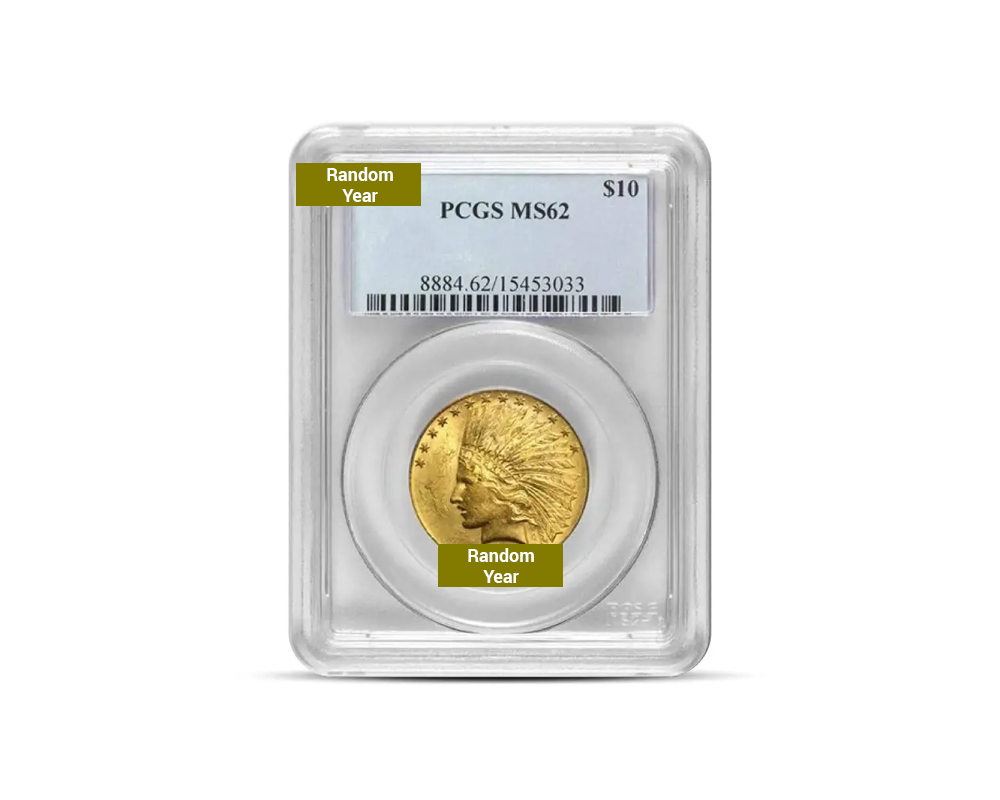 A U.S. coin designed by Augustus Saint-Gaudens and minted between 1907-1933. It features Liberty in a Native American headdress on the obverse and a standing eagle on the reverse. The coin contains 0.48375 oz of .900 fine gold and is certified in Mint State 62 by NGC or PCGS, indicating an uncirculated coin with some noticeable marks.
