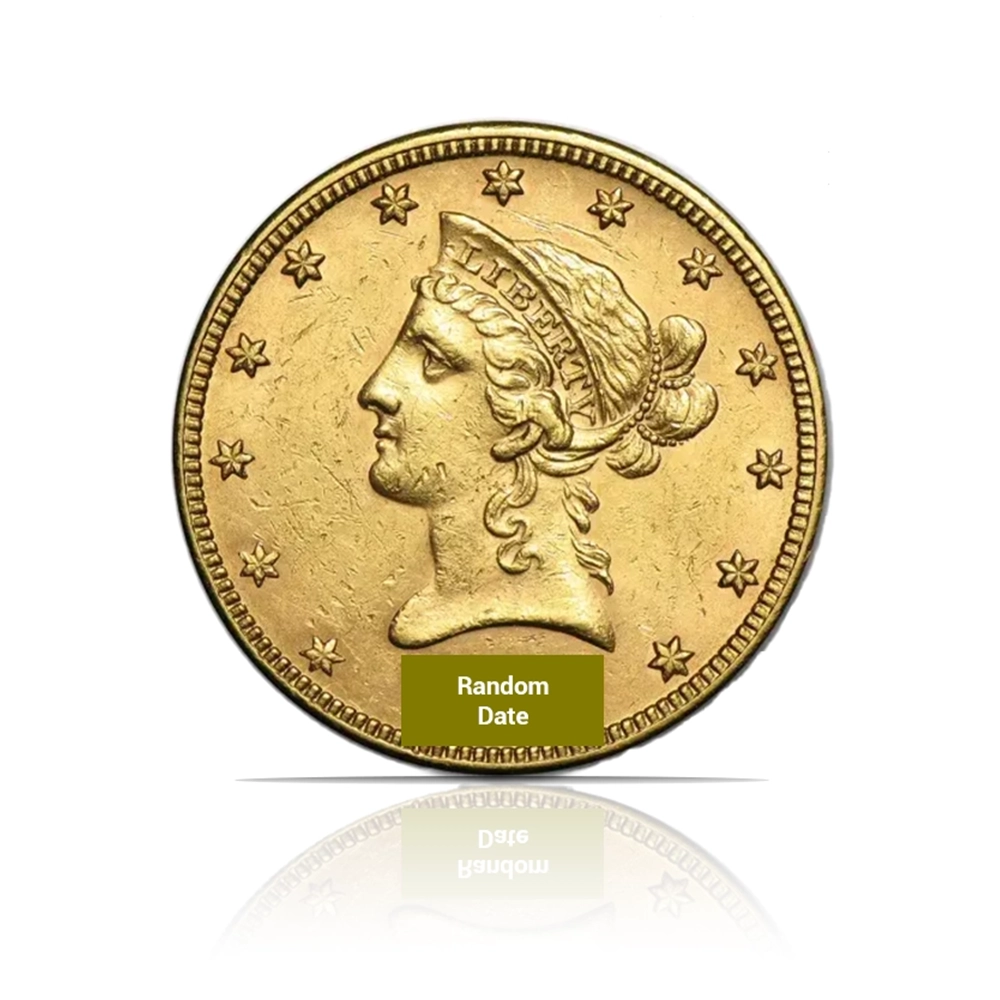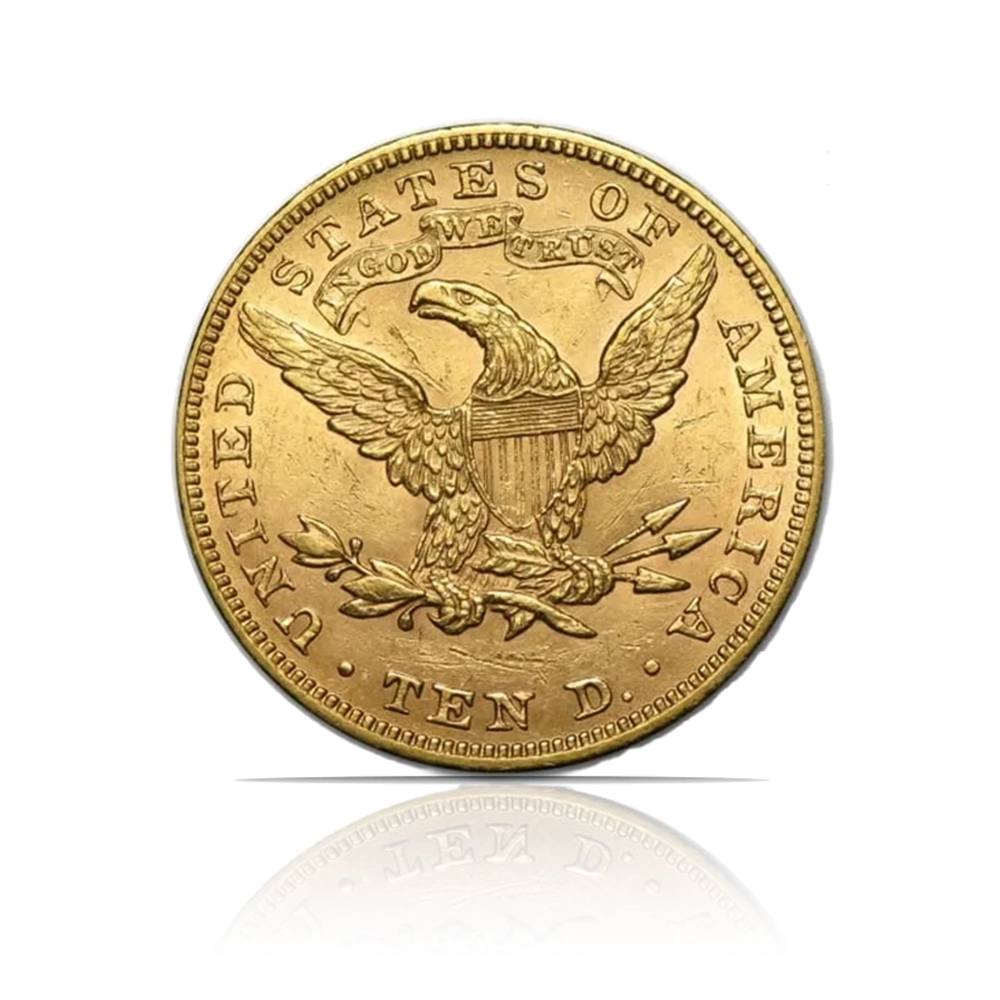 This U.S. Mint coin is a $10 Liberty Eagle from the pre-1933 era. It contains .48375 oz of .900 fine gold and features Lady Liberty on the obverse and an eagle on the reverse. The coin is in About Uncirculated (AU) condition.