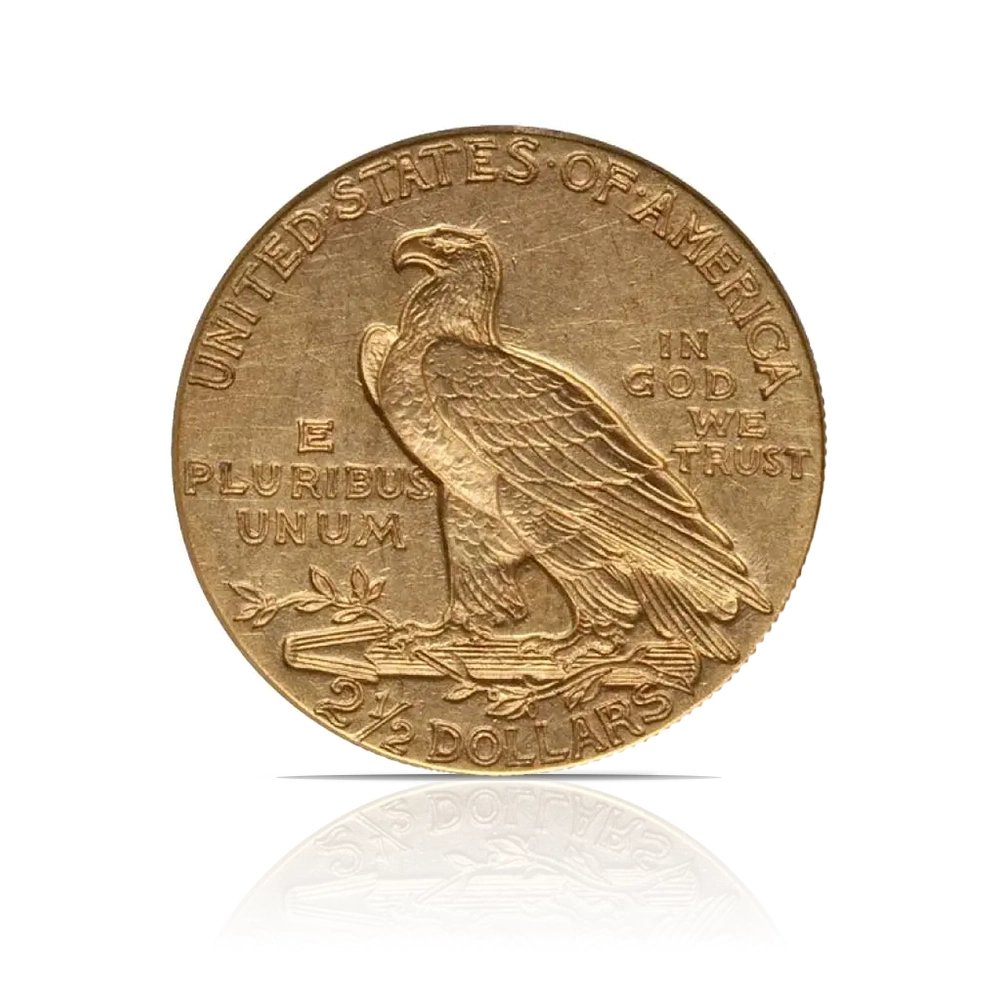 This U.S. Mint coin is a $2.50 Indian Quarter Eagle from the pre-1933 era. It contains .12094 oz of .900 fine gold and features a Native American head on the obverse and an eagle on the reverse in an incuse (recessed) design. The coin is in About Uncirculated (AU) condition.