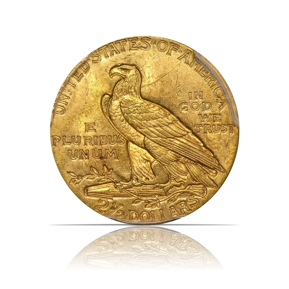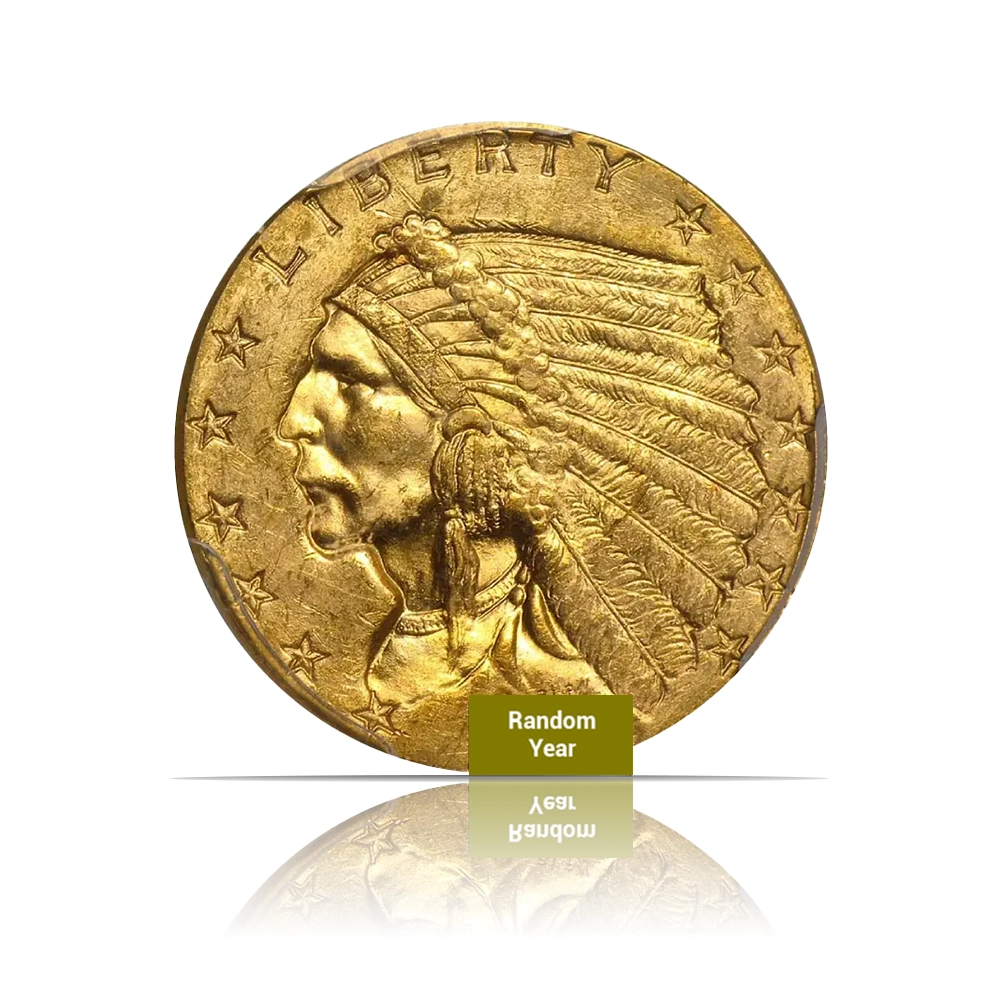 A pre-1933 U.S. gold coin with a $2.50 face value. This 0.1209 oz coin is .900 fine gold and features a unique incuse design. Each piece is certified MS63 by either NGC or PCGS, and the year is random.