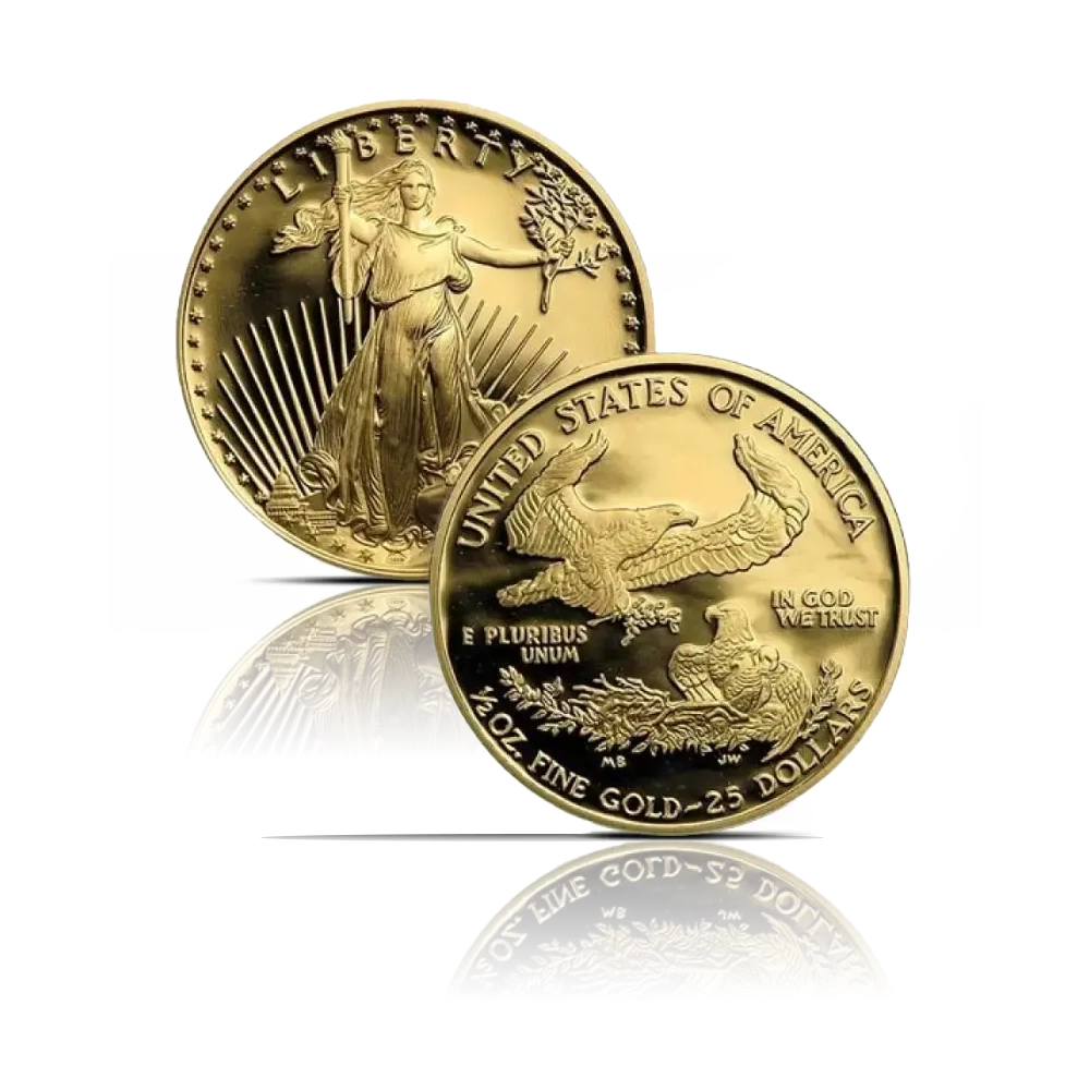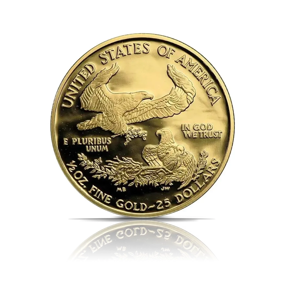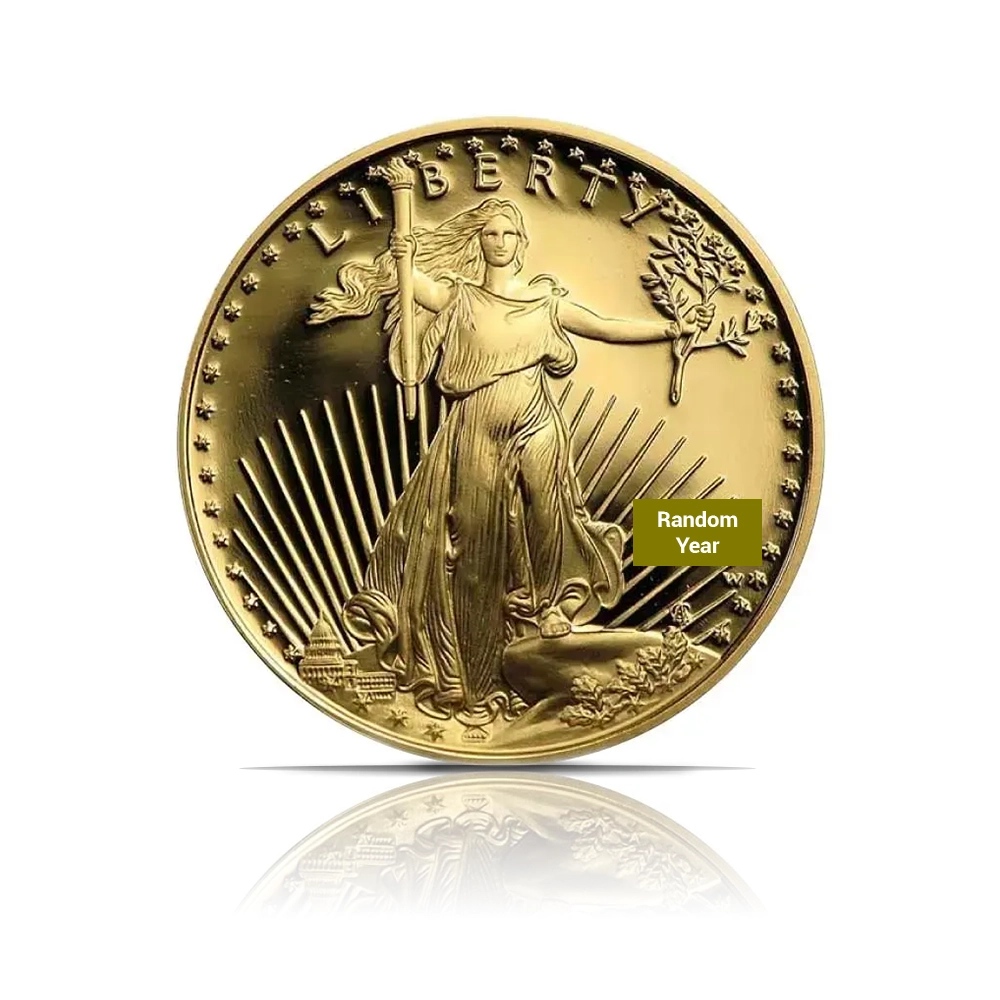 This random year dated America Eagle 1/2 oz .9167 of fine gold proof coin comes in its original mint box. It features Augustus Saint-Gaudens’ iconic Liberty striding forward on the obverse and a powerful family of eagles on the reverse.