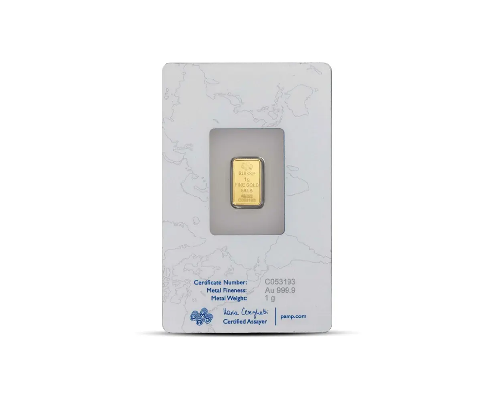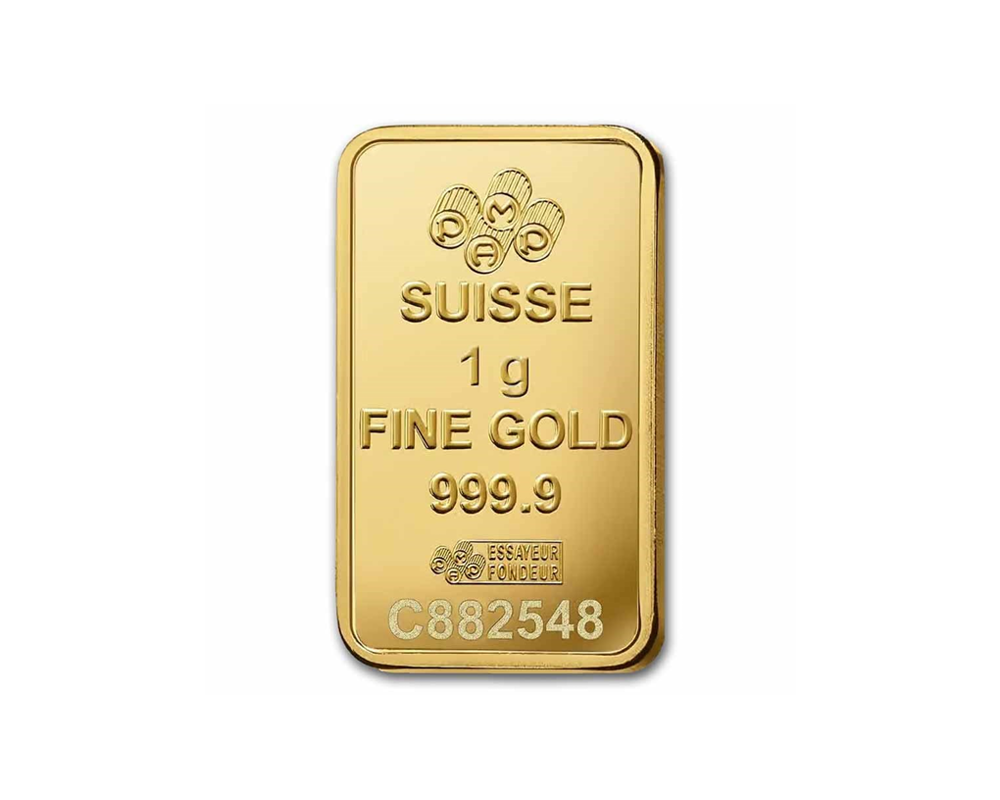This PAMP 1 Gram of .9999 fine gold bar, originating from Switzerland, features an elegant Rosa (rose) design. In the other side, the PAMP logo, purity, weight with unique serial number.