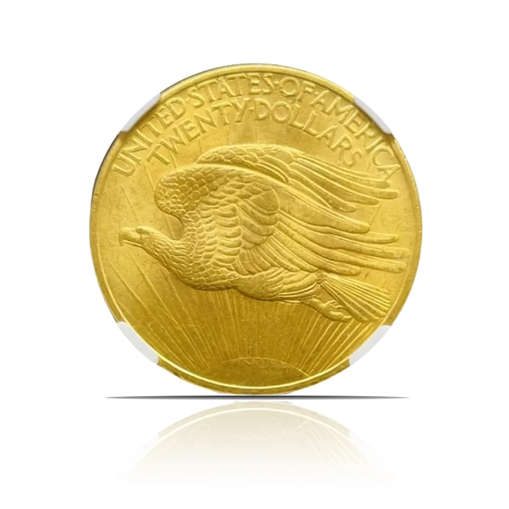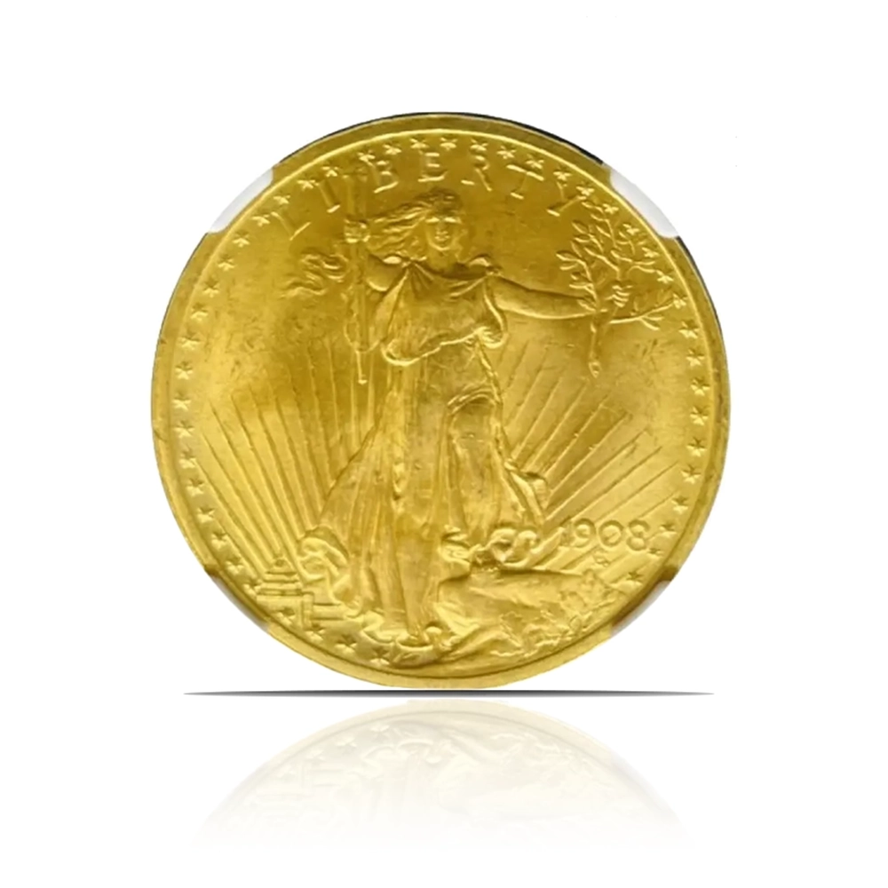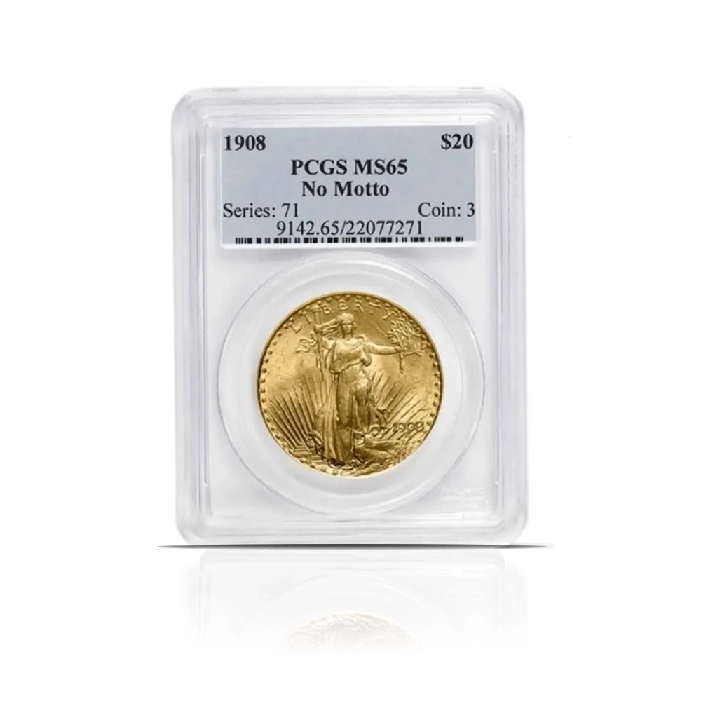 This 1908 – $20 St Gaudens “No Motto” .900 fine gold coin, graded MS65 by NGC or PCGS, is a magnificent and historically significant piece. Designed by Augustus Saint-Gaudens, it features his iconic Liberty striding forward on the obverse and a powerful eagle in flight on the reverse.