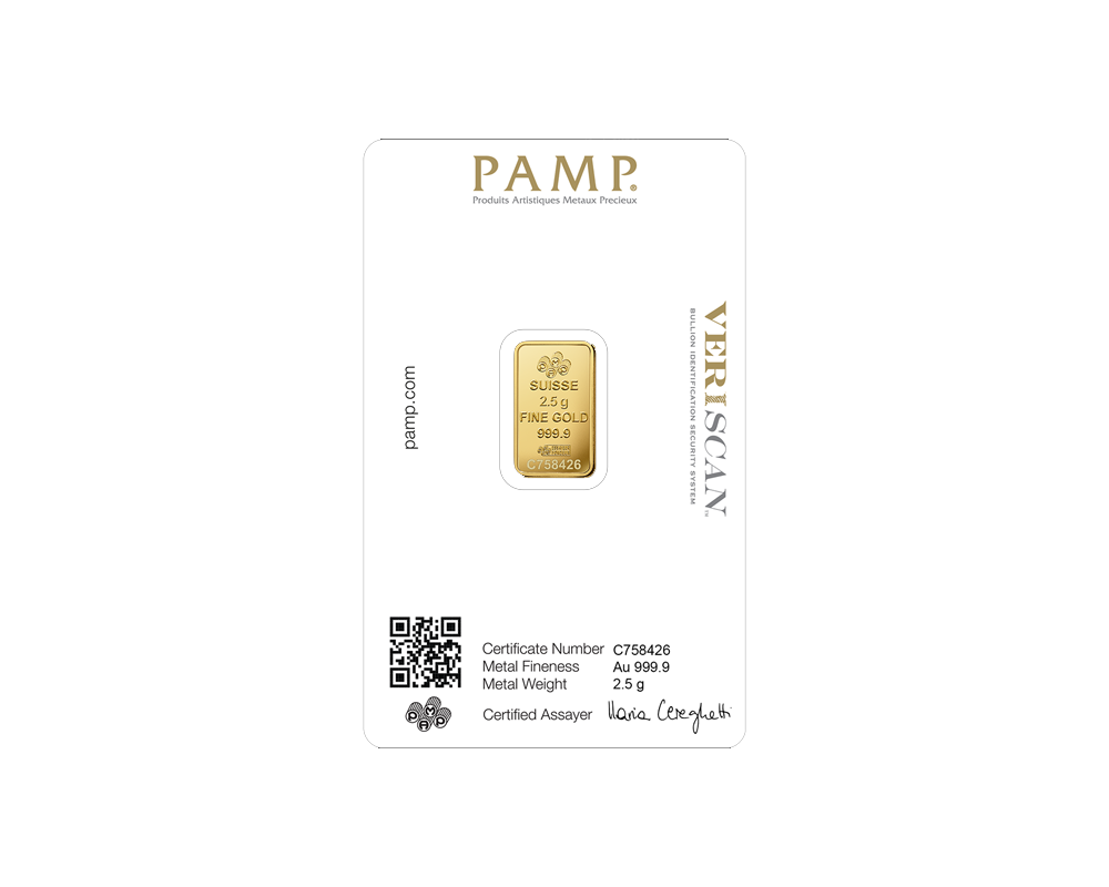 This PAMP from the renowned Lady Fortuna series design is a 2.5 Gram of .9999 fine gold bar, originating from Switzerland. The obverse depicts Lady Fortuna, the Roman goddess of prosperity, while the reverse displays the PAMP logo, purity, weight with unique serial number.