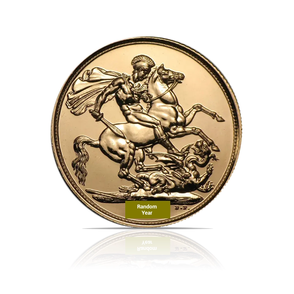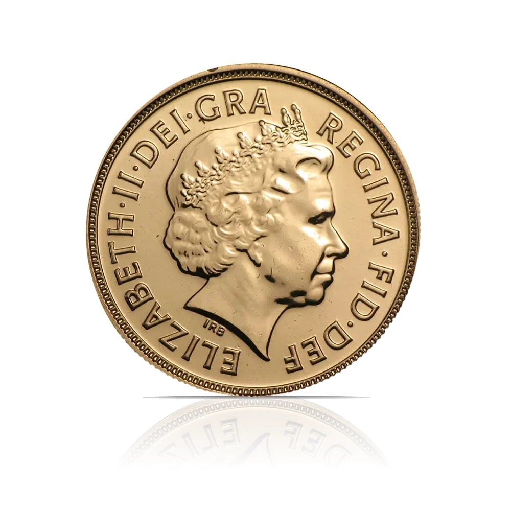 A poignant and valuable memorial. This random year Royal Mint Memorial Sovereign Queen gold coin is a classic tribute to a beloved monarch.