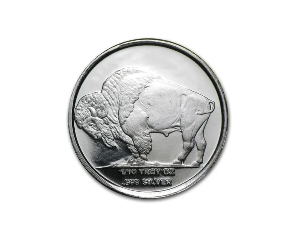 This 1/10 oz of .999 fine silver round by Highland Mint, minted in the United States, features the classic Buffalo design, inspired by the Buffalo Nickel, with a Native American profile and an American bison.